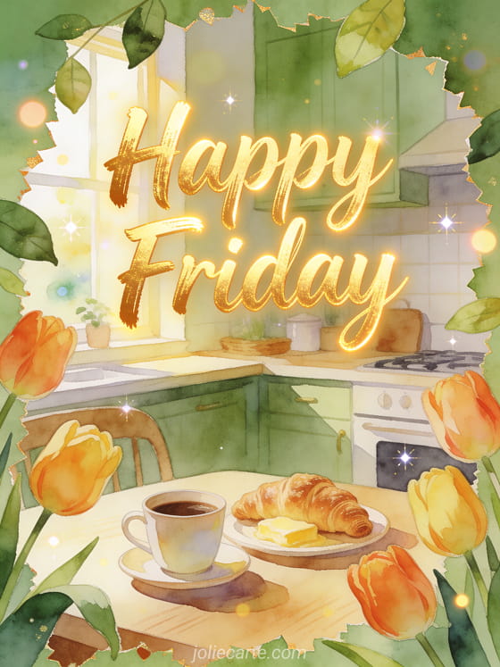 Send a joyful happy Friday greeting with bright tulips, fresh leaves, a coffee cup and buttery croissants on a cozy morning table in a sunlit kitchen. Discover also text to wish a happy Friday, a happy Friday butterfly image or happy Friday animated images.