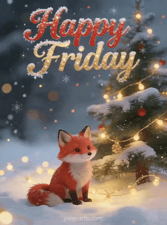 Share a festive happy friday greeting with red and gold script, sparkling frost, an adorable red fox in fresh snow and a decorated Christmas tree with warm fairy lights. Discover also happy friday virtual cards, a happy friday animals card or a happy friday my love card.