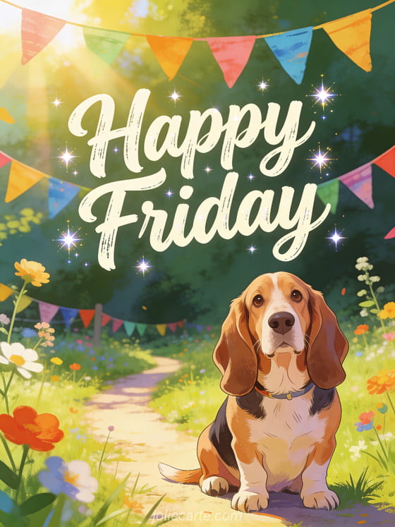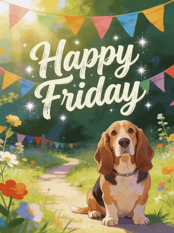 Share a happy Friday dog gif with cream brush lettering, a basset hound on a sunny meadow trail, colorful pennants and wildflowers. You can also send hang in there it's Friday, a happy friday and happy weekend image or happy Friday kisses.