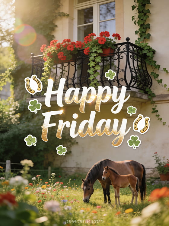 Share a luminous countryside happy friday card with cream painted lettering, golden reflections, horseshoes, clovers, a black wrought-iron balcony covered in red geraniums and ivy, plus a mare and her foal in a flowered meadow below. See also funny happy friday humor, happy friday flower images or happy friday landscape.