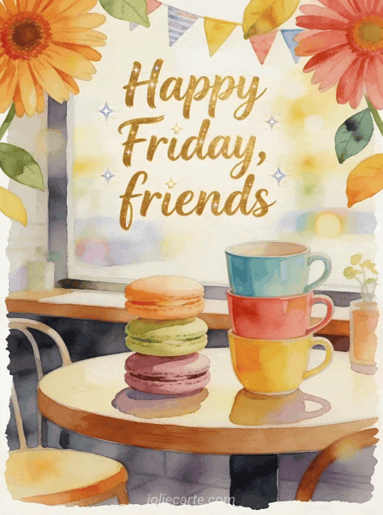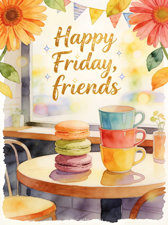 Share a sunny cafe corner in watercolor with stacked macarons, colorful mugs, bunting, and gerbera petals crossing the border. Keep celebrating Friday with happy Friday gifs, sparkling happy Friday image, or happy Friday positive quote image.