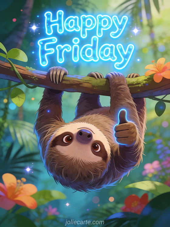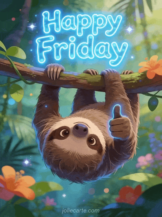 Happy friday funny gif a hilarious happy friday gif with a cool sloth hanging upside down in a tropical jungle