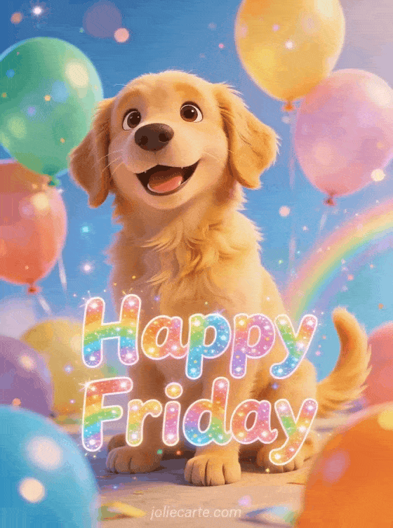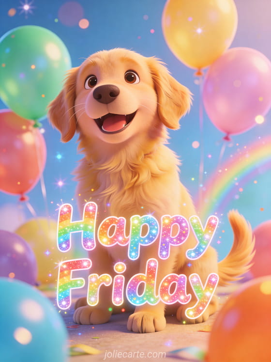 Happy friday gif a festive and joyful happy friday gif with an adorable golden retriever puppy among colorful balloons