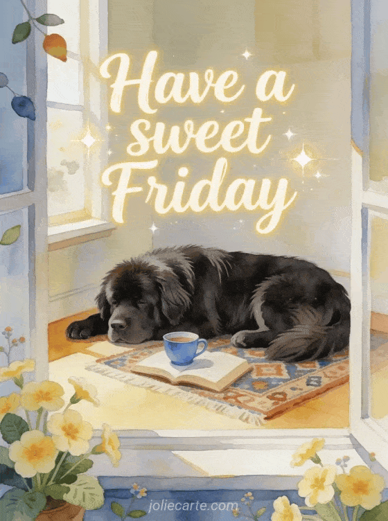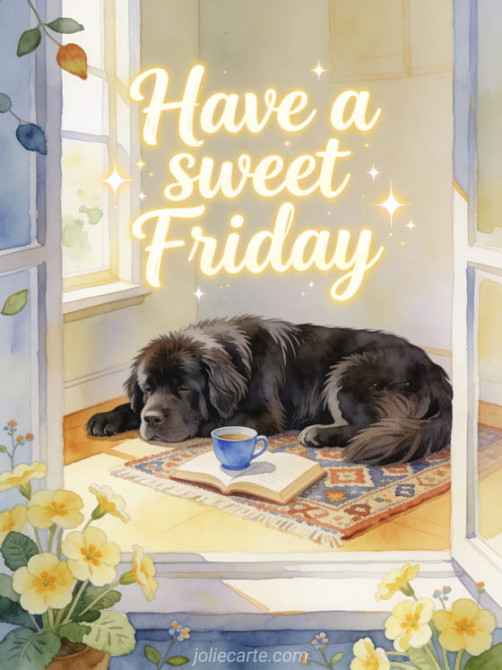 Share a gentle Friday message with a Newfoundland dog resting in a bright reading nook, primroses, a patterned rug and a blue teacup. Discover also a sparkling happy Friday image, a happy Friday positive quote image or Friday good morning images.