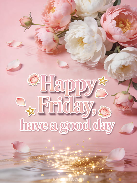 Share a soft happy Friday message filled with peonies, rose petals, golden stars, and a warm wish for a beautiful day. Discover also a good morning excellent Friday day, a beautiful image of happy friday, or a happy Friday sun gif.