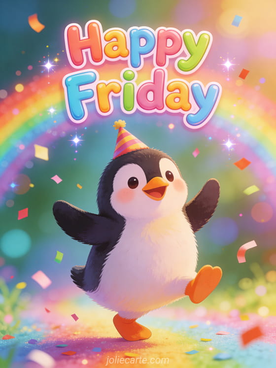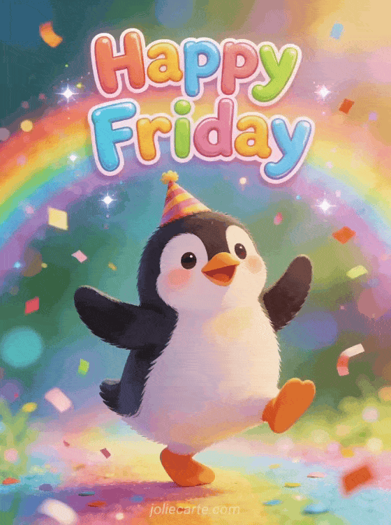 Happy friday humor gif a funny and festive happy friday gif with a dancing penguin and confetti