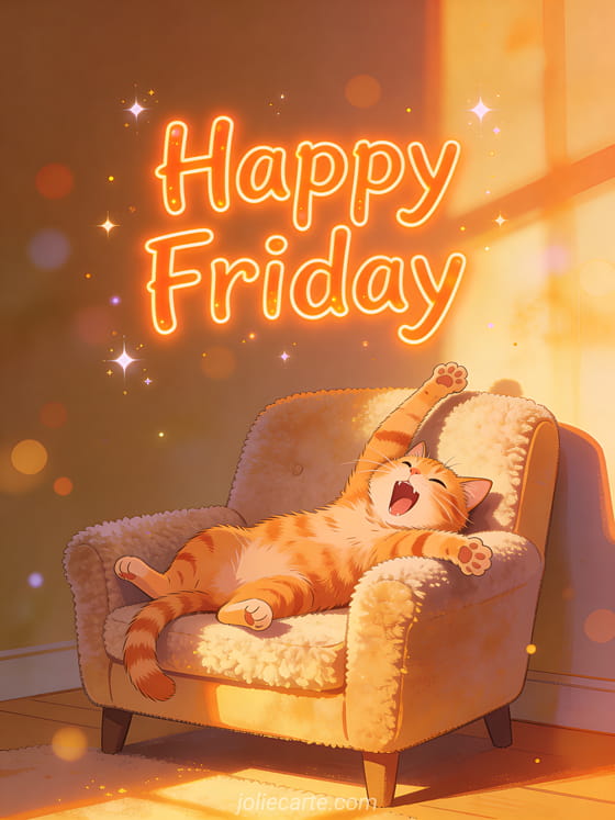 Send a hilarious happy Friday greeting with this fun card. A goofy ginger cat stretching and yawning lazily on a cozy armchair in a sunny spot. Discover also a happy Friday hedgehog card or a wintery friday wish.