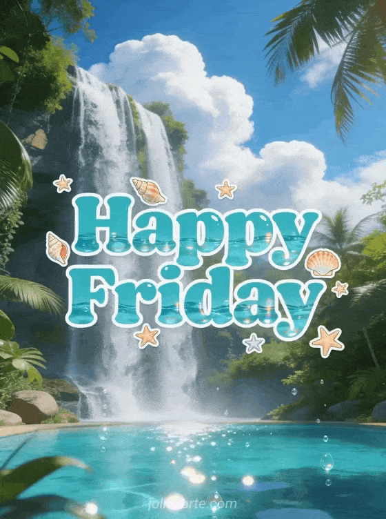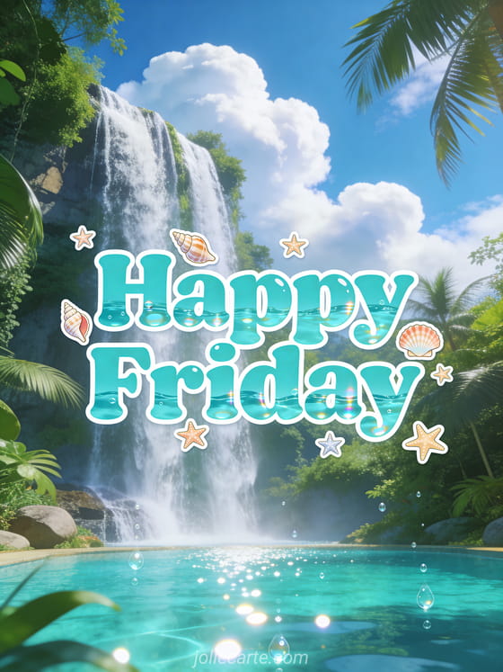 Share a lush happy friday card with rounded turquoise lettering, water reflections, seashells, little starfish, a majestic waterfall pouring into an emerald natural pool, bright blue sky, cottony white clouds and tropical greenery. See also happy friday good end of week humor, happy friday coffee image or message to wish Muslims a happy friday.