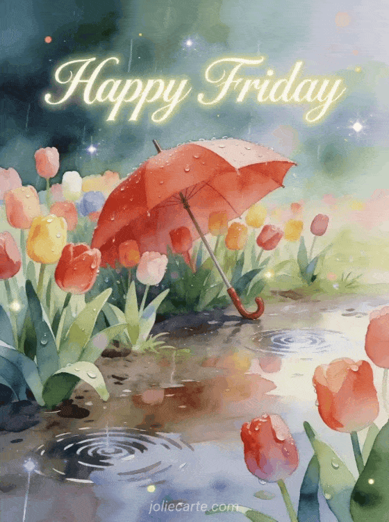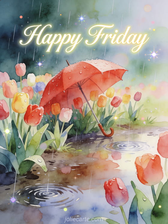 Share a gentle and fresh Friday rainy day greeting with glistening tulips and a red umbrella. Discover also a landscape nature happy friday or a happy friday message card.