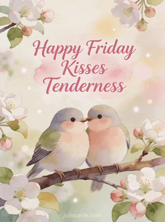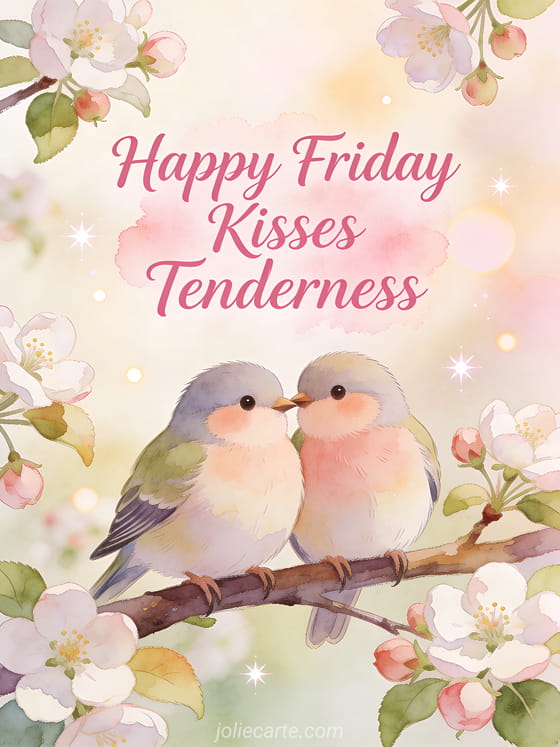 Share a tender and loving happy Friday greeting with lovebirds on a spring apple tree. Discover also a happy friday nature card or a happy friday picture card.