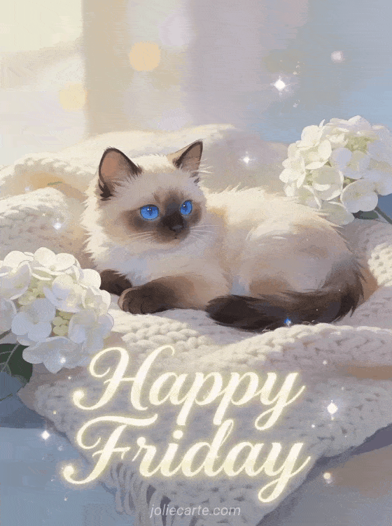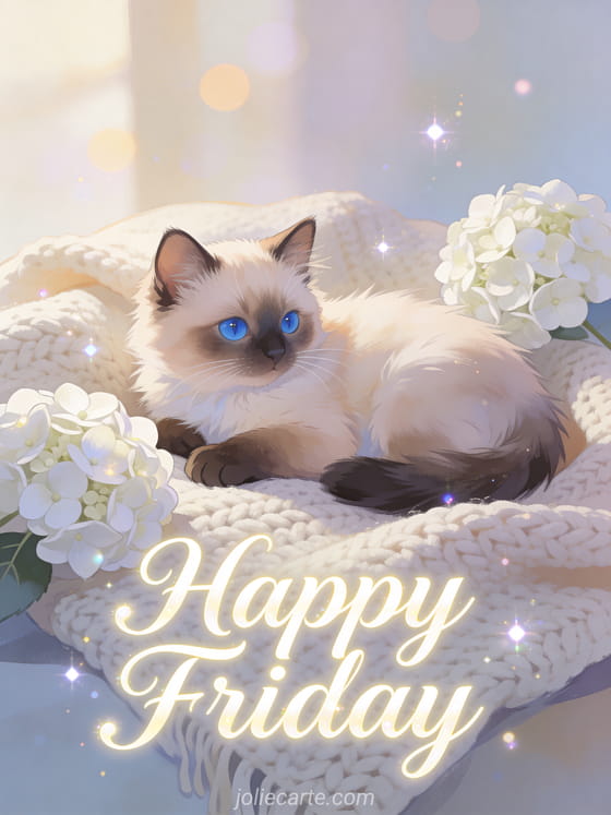 Share a gentle happy friday greeting with elegant cream shimmer lettering, a fluffy Siamese kitten with blue eyes resting on a cozy knitted blanket and white hydrangeas nearby. Discover also good morning friday images, a happy friday Christmas card or happy friday virtual cards.