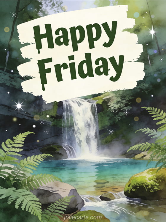 Share a peaceful happy friday greeting with rustic forest green lettering, a majestic waterfall cascading into a crystal clear pool, lush ferns and mossy rocks. Discover also a happy friday card, a good morning it's friday humor card or a good day friday card.