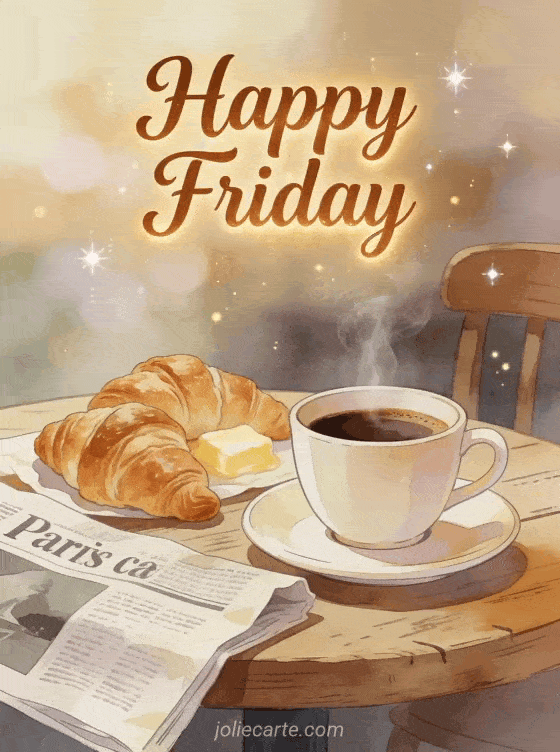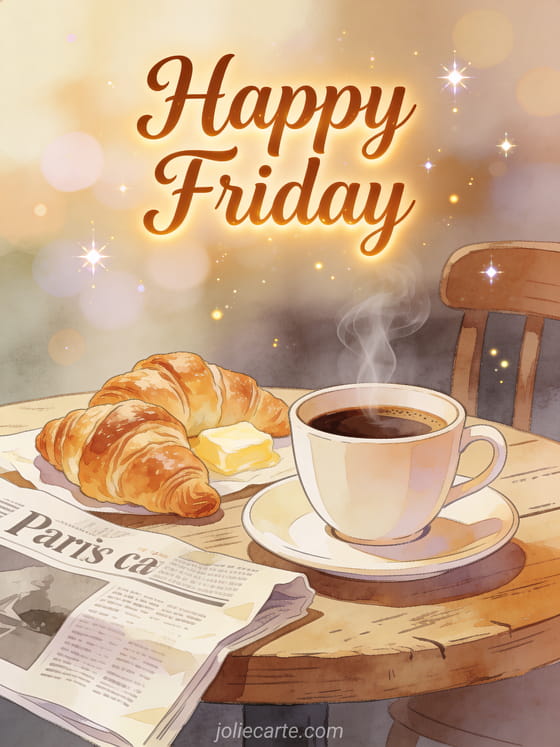 Send a warm happy Friday greeting with caramel lettering, a steaming espresso cup, fresh croissants and a morning newspaper on a rustic table. Discover also good morning friday landscape, happy Friday images or happy friday good end of week humor.