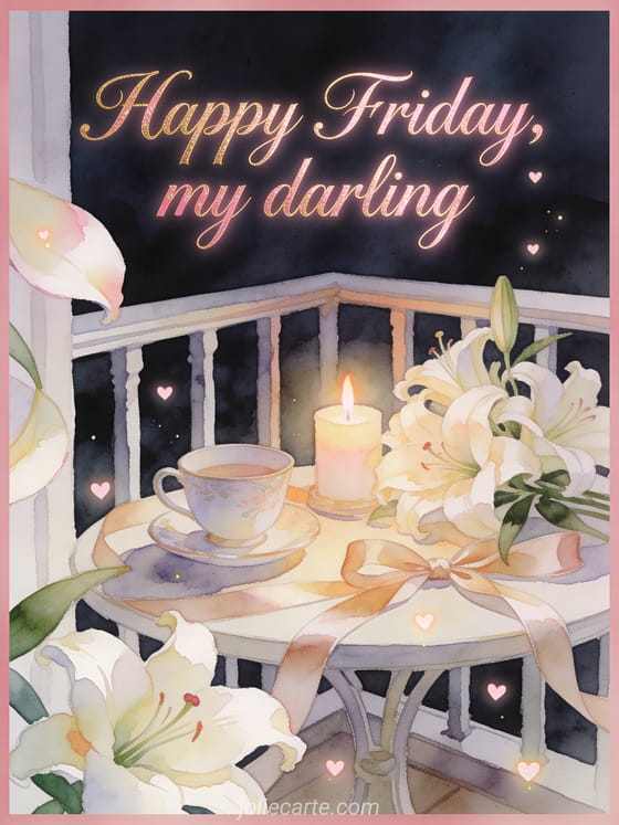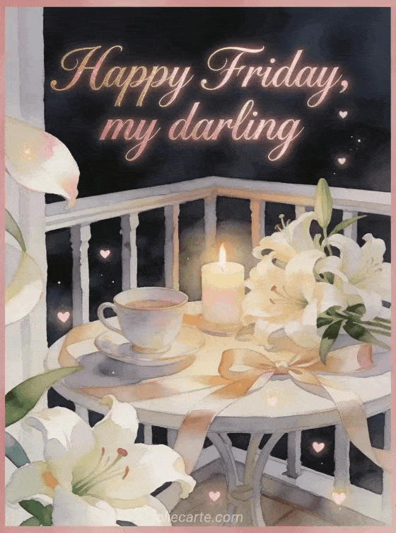 Send happy Friday, my darling with rose-gold script, a romantic balcony table, a porcelain tea cup, cream lilies, satin ribbon and tiny heart lights. Discover also happy Friday cat image, happy friday everyone image or happy Friday pictures animated.