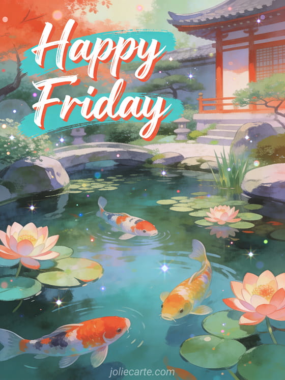 Share a zen happy Friday picture with a peaceful koi pond and lotus flowers. Discover also a good morning friday humor card or a happy friday image card.