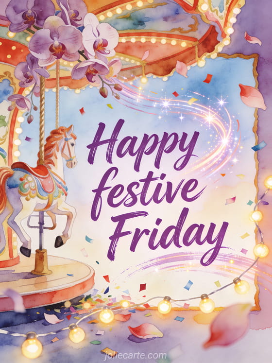 Share a festive happy Friday with a lively watercolor scene where orchid blooms sweep around a whimsical carousel horse, confetti swirls, and glowing fairy lights. You can also send an animated happy friday gif, a sunny happy Friday image, or a very beautiful happy friday image.