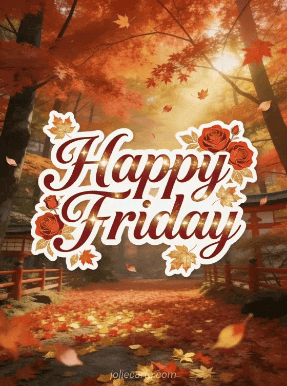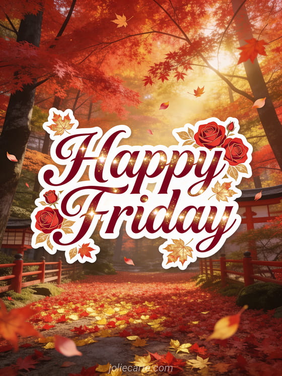 Share a happy Friday message surrounded by red roses, golden maple leaves, and a glowing Japanese autumn forest. Discover also a sparkling happy friday sparkling gif, a happy Friday good day images, or a good morning excellent Friday day.