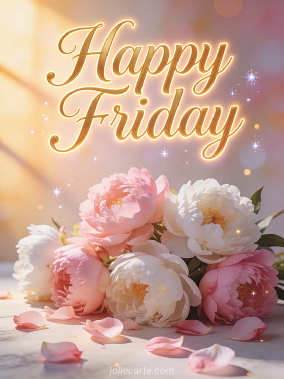 Welcome the weekend with this beautiful card featuring an elegant arrangement of pink and white peonies with scattered rose petals in warm morning light. Discover also a happy Friday card, a happy Friday kisses card or a good morning beautiful Friday card.