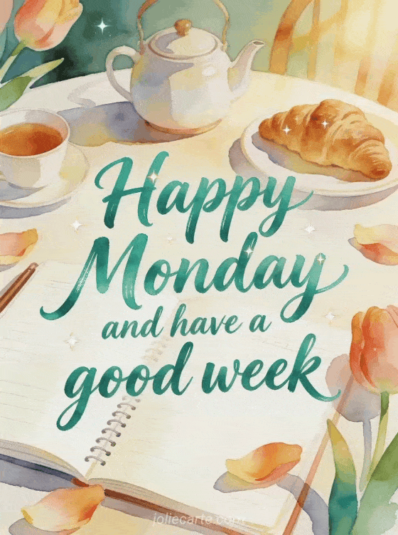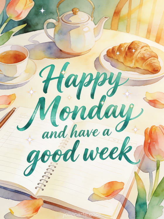 Send a cheerful happy Monday greeting with a cozy breakfast scene and a warm wish for the week ahead. Discover also a Monday good day images, a good morning Monday image or a happy monday flowers image.