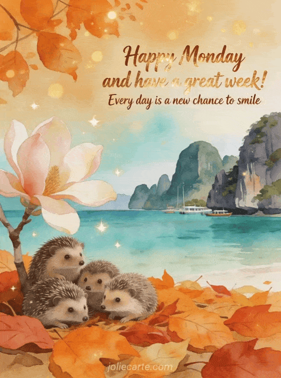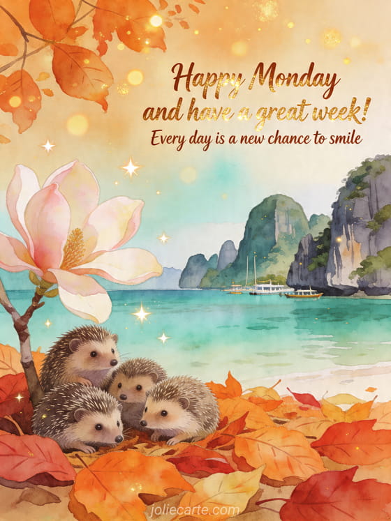 Share an inspiring Monday message with a turquoise lagoon, autumn leaves, a family of hedgehogs and blooming magnolia. Discover also virtual happy monday card, happy monday e-card and happy monday card.