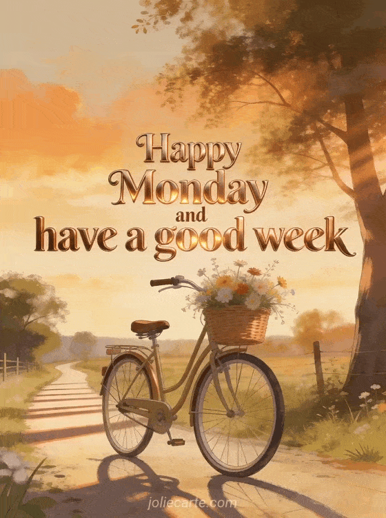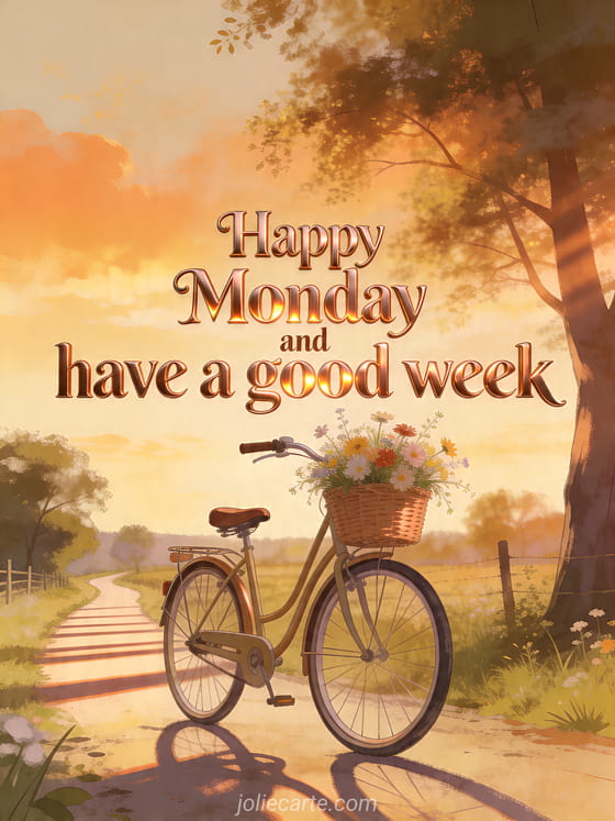 Send a nostalgic Monday and good week message with this photorealistic card showing a vintage bicycle filled with wildflowers on a country path. You can also discover wish a happy monday and a good week, good morning happy monday good morning good week or coffee happy monday images.