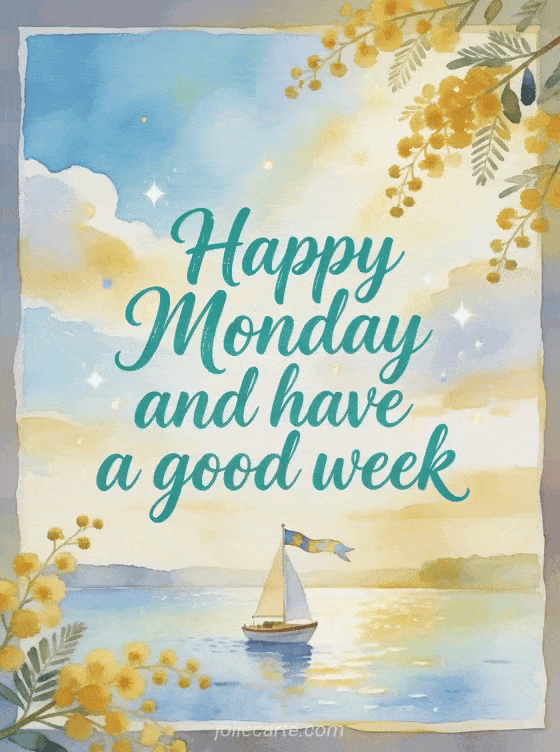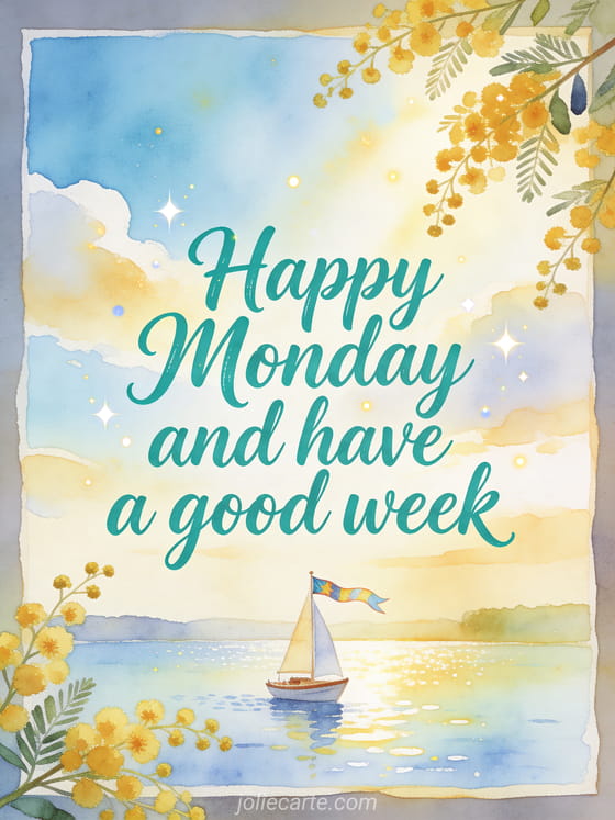 Send a confident happy Monday and good week greeting with fresh teal calligraphy, sparkling dots, a small sailboat on a bright lake, a flag ribbon and mimosa sprigs in gentle golden light. You can also share a monday good morning kisses gif, a happy Monday coffee gif or a happy Monday floral image.