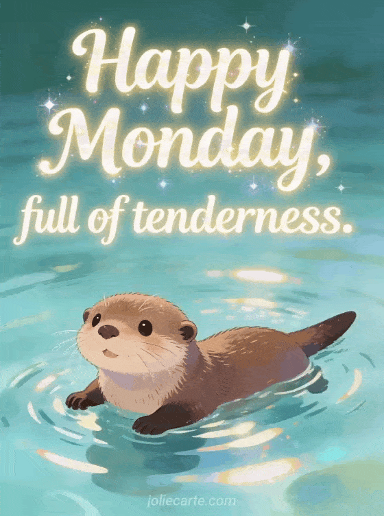 Send a tender happy Monday greeting with a playful otter floating in clear water with bright ripples. Discover also monday kisses gif, good morning Monday card or good morning happy monday coffee.