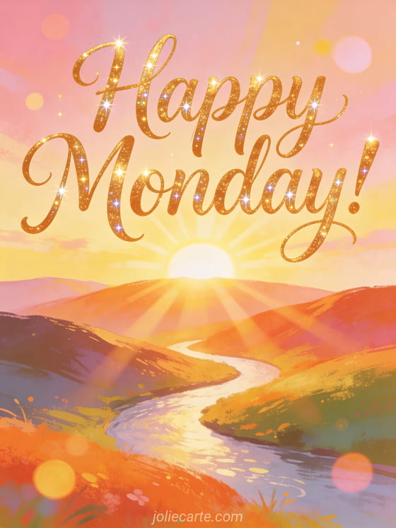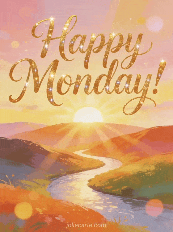 Share happy Monday cards with flowing golden calligraphy, a sunrise over rolling hills, a winding river and soft light rays. You can also send a free virtual happy Monday card, a happy Monday good week gif or a happy Monday animated image.