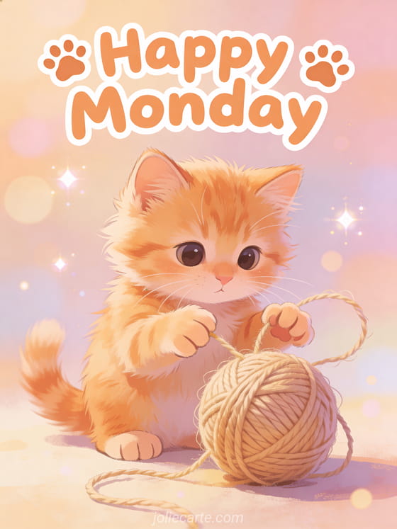 Share a sweet happy Monday cat greeting with an adorable ginger kitten playing with yarn. The perfect cute card to brighten someone's Monday. Discover also a funny happy monday image card or a happy monday humor kisses card.