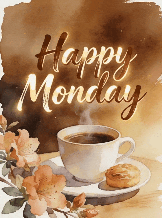 Start the week with a warm happy Monday greeting in watercolor, with a steaming coffee cup, a small pastry and azalea blossoms. Discover also happy Monday floral image, happy Monday animated gifs or happy Monday sun image.