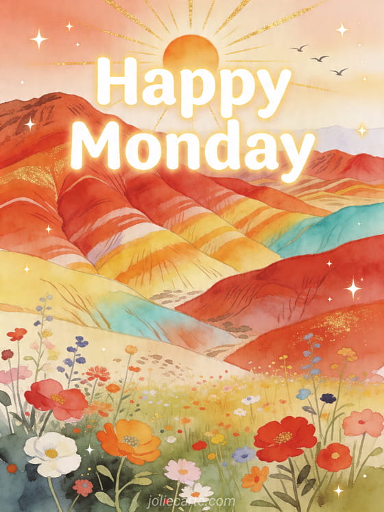 Share a radiant Happy Monday greeting with rainbow mountains, wildflowers and warm sunshine. Discover also happy monday card, good morning monday morning and animated happy monday gifs.
