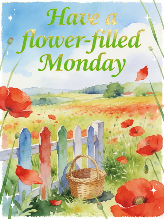 Wish a flower-filled Monday with a bright watercolor country meadow, red poppies, a small wicker basket, and a painted fence. Discover also a snowy happy Monday image, a happy Monday good start to the week images or happy Monday images gifs.