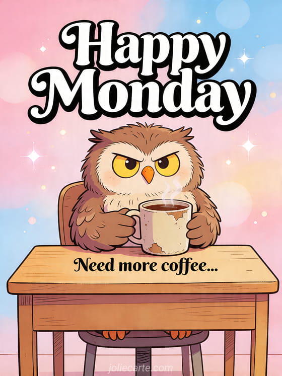 Send a funny Happy Monday card with a grumpy owl and a coffee mug to make the morning lighter. Discover also happy monday and good week, stay strong happy monday and pretty happy monday image.