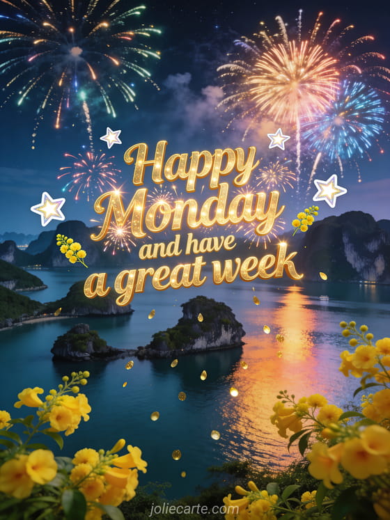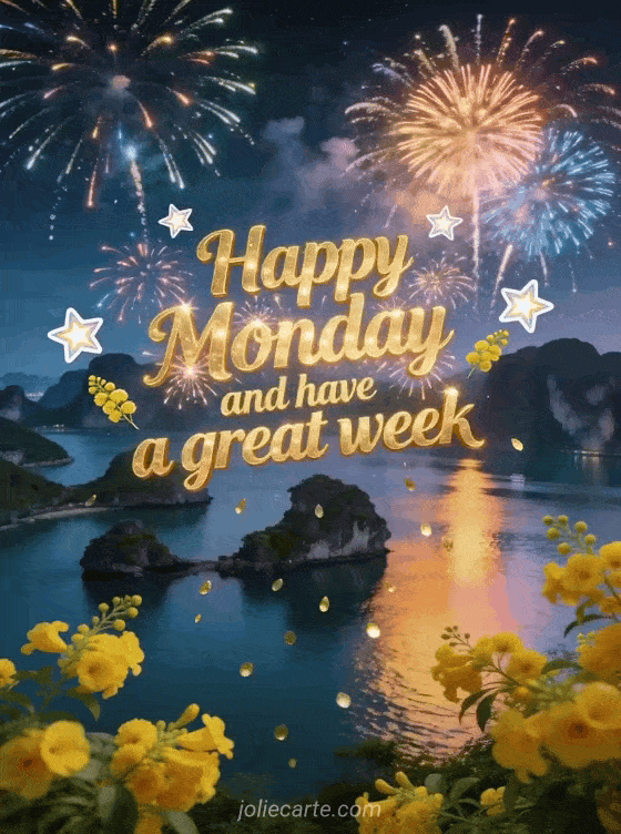 Start the week with a festive happy Monday over Ha Long Bay, with colorful fireworks, yellow mimosa blossoms and golden reflections on calm water. Discover also happy Monday kisses gifs, happy Monday good week gifs or animated happy Monday gifs.