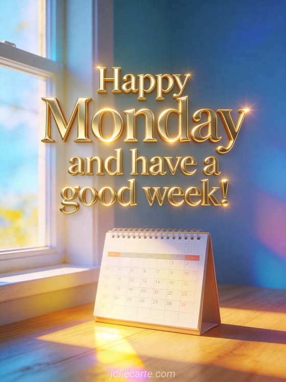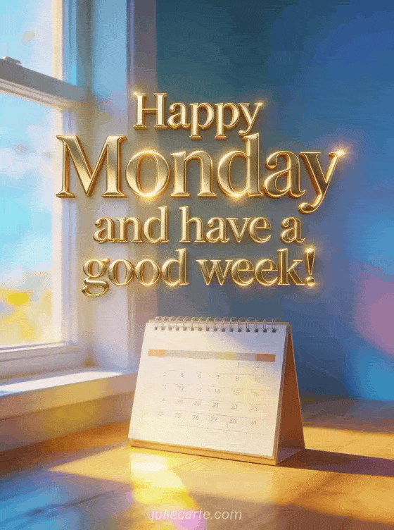 Share a happy Monday good week gif with refined golden typography, a fresh calendar on a desk by a sunlit window and colorful morning light. You can also send a happy Monday animated image, a free happy Monday good week image or good morning happy monday have a good week kisses.