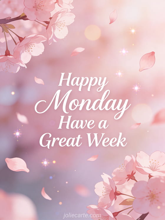Share a sweet Monday greeting with cherry blossom petals and a tender message. Discover also a happy monday and good week humor or a gif happy monday and great week card.