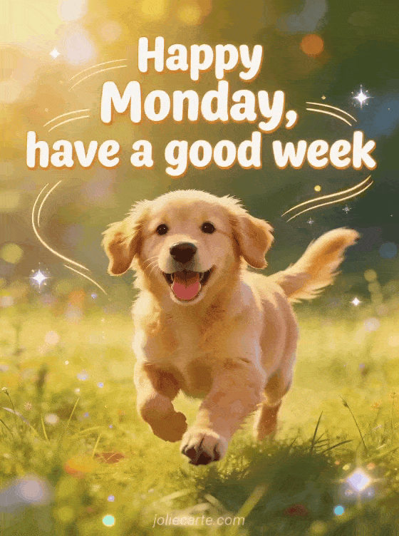Send an energetic happy Monday and good week greeting with animated-style lettering and a joyful golden retriever puppy running through a meadow. Discover also a happy Monday coffee image, happy monday good morning have a good week or a good morning and happy Monday gif.