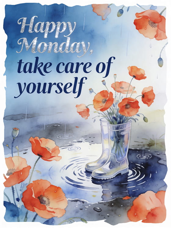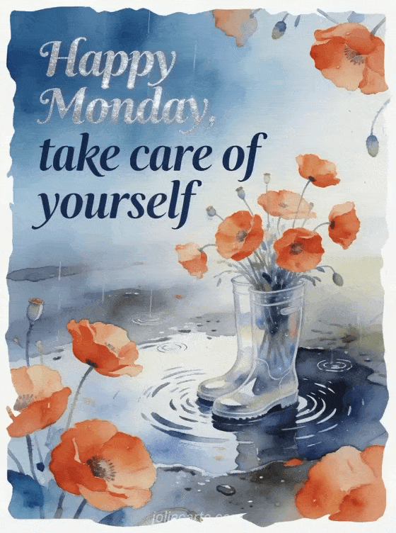 Send a comforting happy Monday message with a soft watercolor rain scene and bright poppies. Discover also a happy Monday and good week animated gif, a Monday good day image or a good morning Monday image.