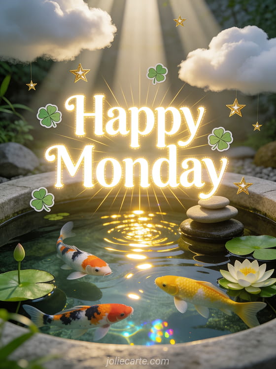 Share a peaceful happy monday card filled with glowing white lettering, lucky clovers, golden stars and a zen koi pond with water lilies. For more monday inspiration, see this free happy monday and great week images card, these happy monday everyone images or a cozy monday good coffee images greeting.