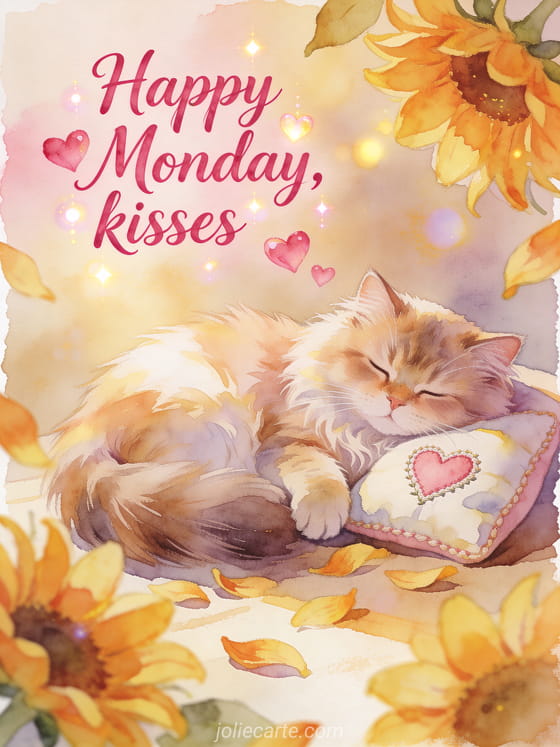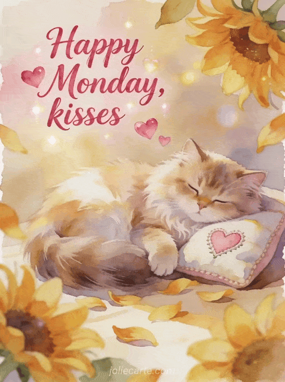 Share a sweet happy monday kisses card with a sleeping Persian cat, a heart cushion and golden sunflower petals. Discover also a happy Monday heart gif, a rainy happy monday image or a good morning happy monday images gif.