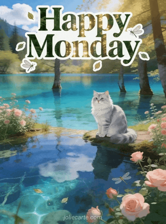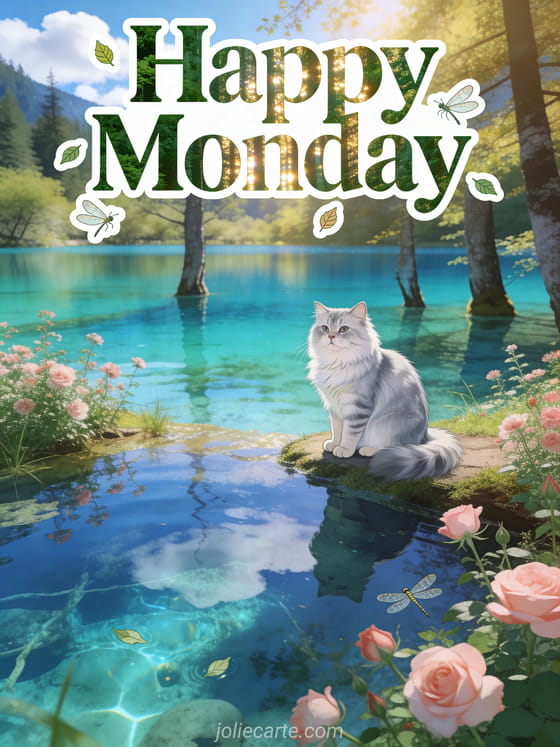Share a dreamy happy monday card with forest green lettering, golden light, small leaves, dragonflies, the multicolored Jiuzhaigou lakes in turquoise and emerald tones, a silver chinchilla Persian cat by the water and pink wild roses on the shore. See also free happy monday image, happy monday animals gif or monday kisses gif.