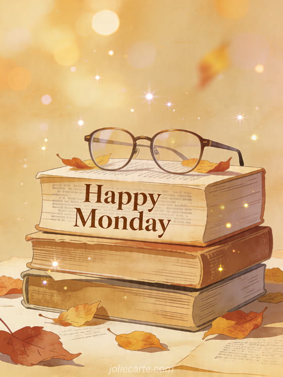 Send a Happy Monday card with vintage books, reading glasses and autumn leaves for a calm and thoughtful start. Discover also funny gif happy monday humorous, good morning and happy monday and funny stay strong happy monday.