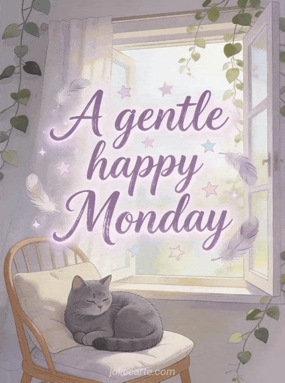 A gentle happy Monday a soft Monday greeting with a cozy cat