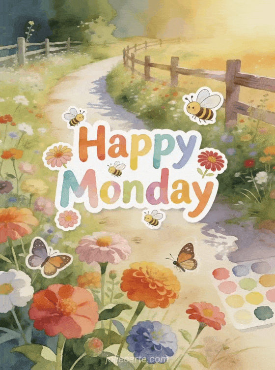 Share a gentle Happy Monday greeting with colorful zinnias, butterflies and warm morning light along a country path. Discover also good morning happy monday image, friendship excellent happy monday and good week and good week happy monday good week.
