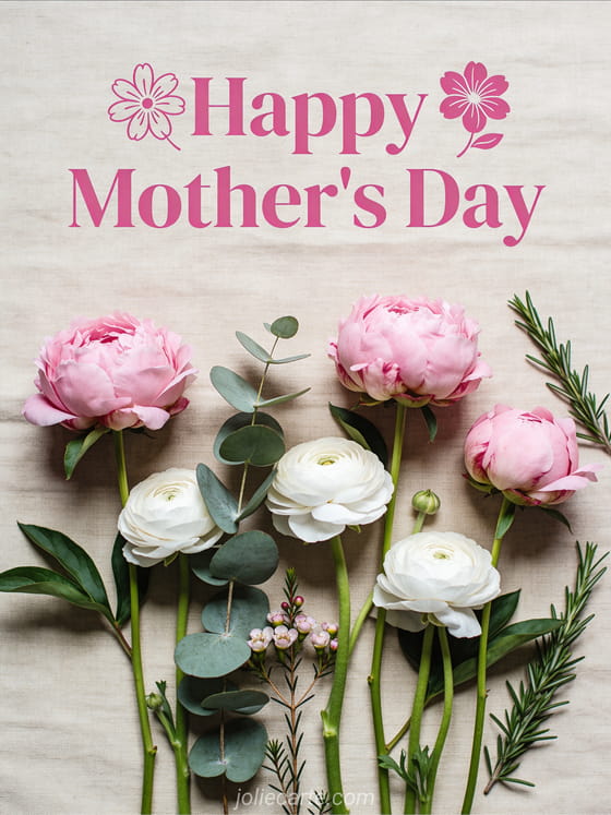 Share heartfelt Mother's Day wishes with this elegant photorealistic flat lay featuring pink peonies, white ranunculus and eucalyptus. Discover also happy mother's day cards or a card for mother's day.
