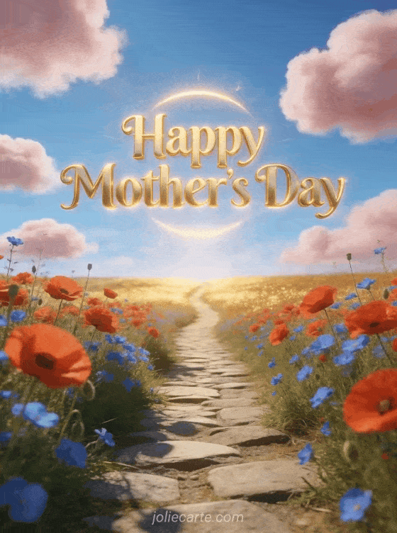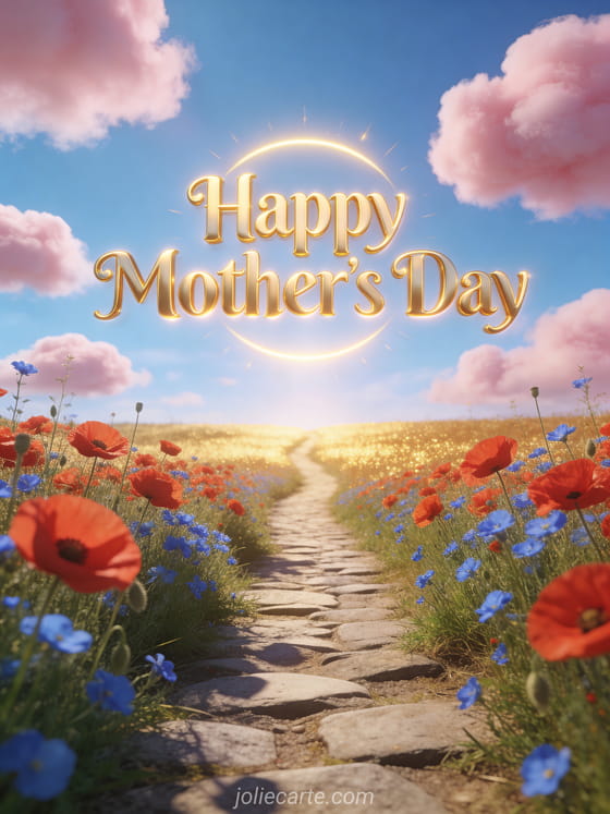 Share this luminous happy mother's day card. A countryside path bordered by poppies and cornflowers leading toward a golden horizon under a blue sky with pink clouds. Discover also a mother's day free image or a happy mother's day mom card.