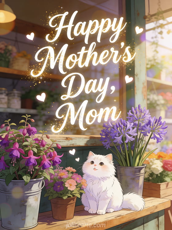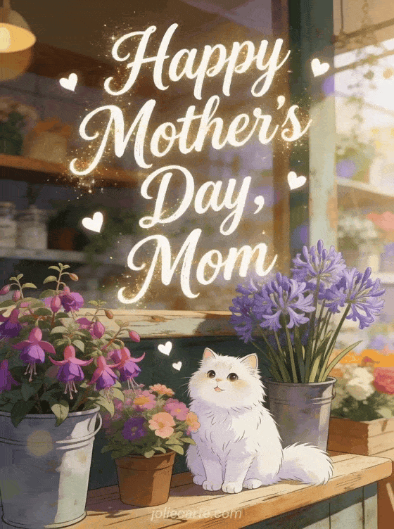 Share this heartwarming happy mother's day gif card. A cozy florist boutique with fresh fuchsias and agapanthus, a white Persian cat sitting happily among the flowers with small hearts floating in the air. Discover also a short poem for mother's day or a free mother's day card.