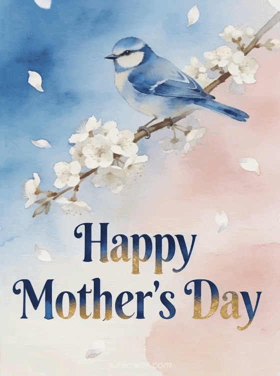 Celebrate your mom with this elegant Happy Mother's Day card featuring a blue tit perched on a blossoming hawthorn branch in a beautiful watercolor style. Discover also a Mother's Day card for mom or a free Mother's Day card.