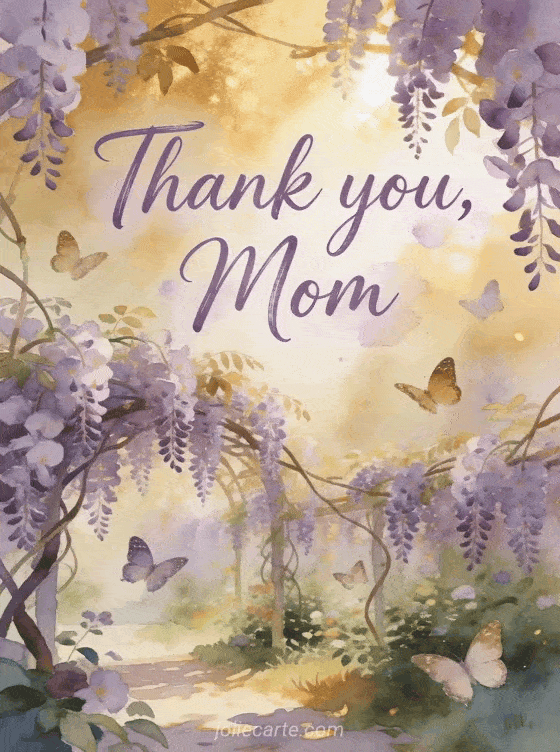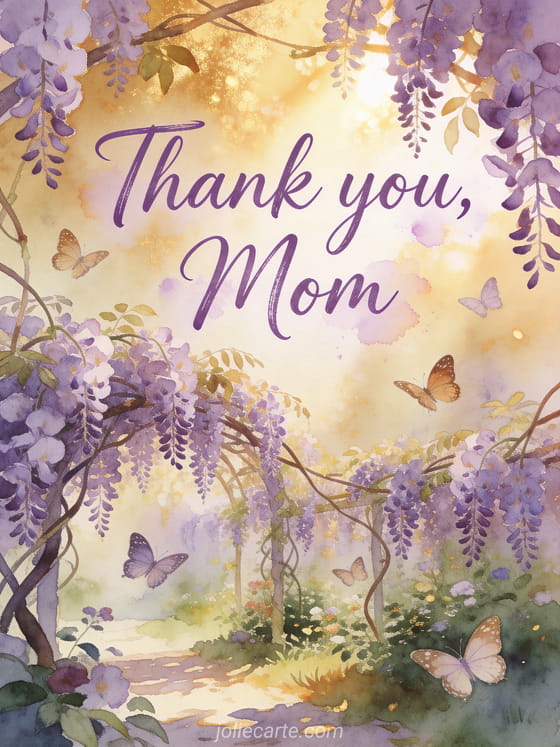 Share this poetic mother's day card with purple watercolor letters in a beautiful wisteria garden with butterflies and golden light. Discover also happy mother's day images or free mother's day cards.