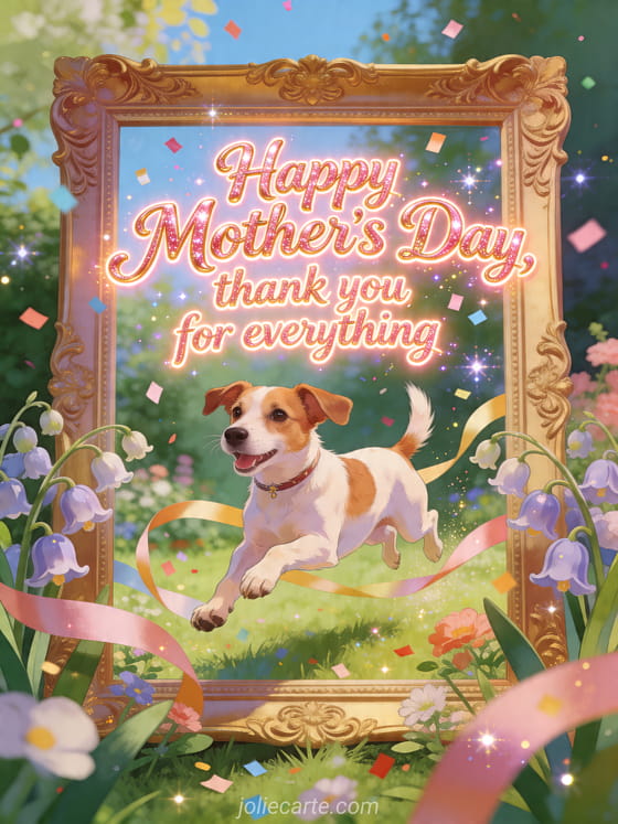 Share a playful Mother's Day card that says thank you for everything, with a Jack Russell leaping through ribbons and bellflowers around a golden garden frame. Discover also images for Mother's Day, words for Mother's Day, or a photo for Mother's Day.